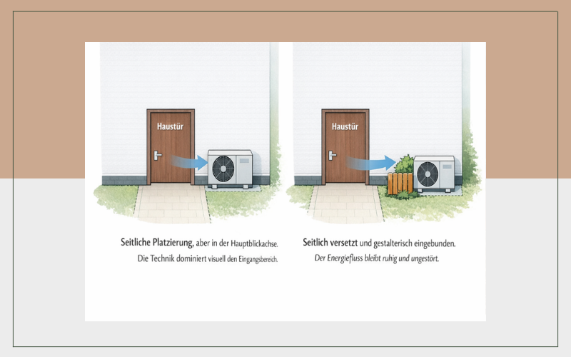 Deshalb ist nicht nur entscheidend, was installiert wird – sondern auch wo. Die Platzierung ist zu überdenken, auch wenn der VDI empfiehlt, die Wärmepumpe links vor der Haustür aufzustellen. Wir dürfen selbst überprüfen, ob uns diese Wärmepumpe direkt vor der Haustür ein Dorn im Auge ist.